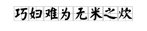 巧妇难为无米之炊[qiǎo fù nán wéi wú mǐ zhī chuī],是一句谚语,意思为:即便是再聪明能干的妇女,没米也还是做不出饭来。同时也比喻再有能力的人,办事情时如果缺少某些必要的条件,也很难成功。