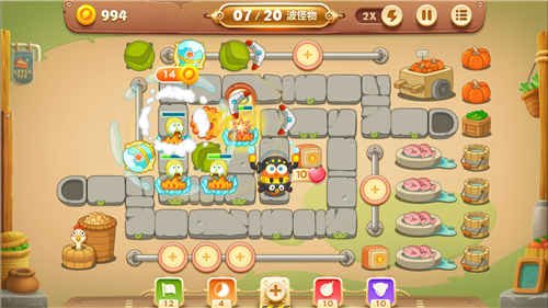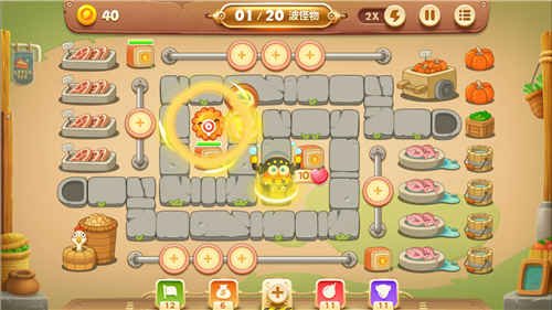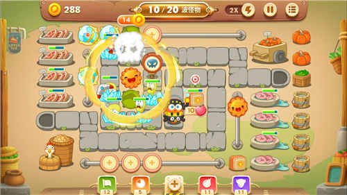 在这个关卡中主要用到的就是【雪球】和【太阳花】了,两个都有范围伤害的炮塔,雪球塔还会附加减速效果,是本关卡中唯一一个减速道具哦,目标越多伤害越高,种在道路的两旁,作为主力输出来使用,千万别小看了大范围雪球塔的威力!