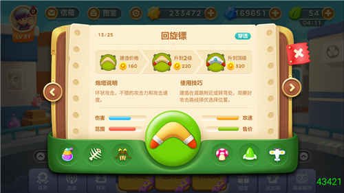 讲到这里有一款炮塔不得不说一下,那就是【回旋镖】,大多数情况下类似【火焰瓶】【魔法球】这种炮塔更受到我们的青睐,但是在一些特殊关卡中回旋镖的作用是不容小觑的,首先是低廉的价格,起步只需160金币,超大的攻击范围,特殊的环状攻击弹道是这款炮塔拨人眼球的地方!